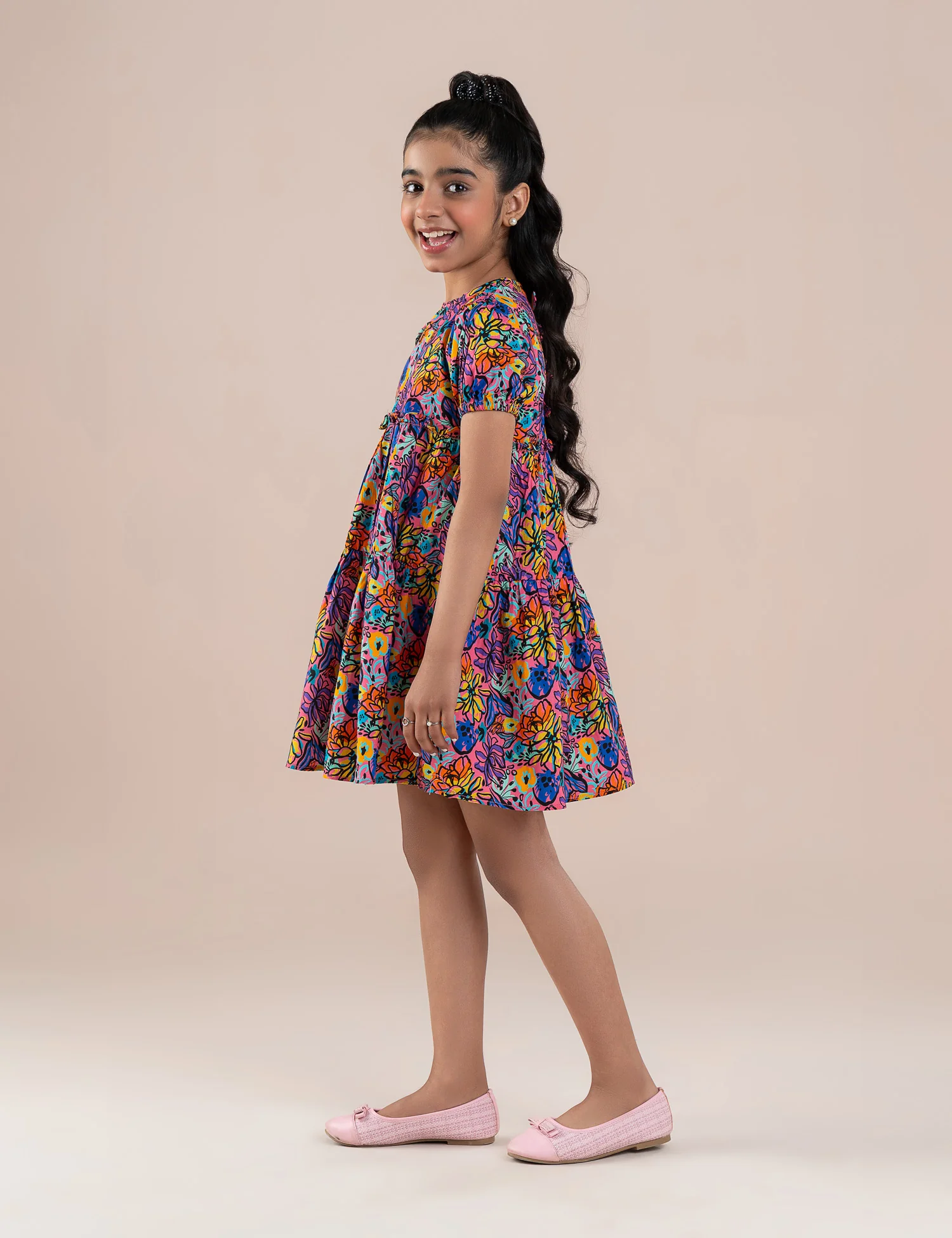 Add a burst of color to her wardrobe with this beautiful floral printed dress for girls. Designed with an eye-catching all-over floral pattern, this dress features a comfortable round neckline, short sleeves, and a stylish tiered silhouette that offers a playful and flowy look. Made from soft, breathable fabric, it ensures all-day comfort while allowing easy movement. Perfect for casual outings, parties, or summer days, this dress pairs effortlessly with sandals or sneakers for a charming and cheerful outfit.