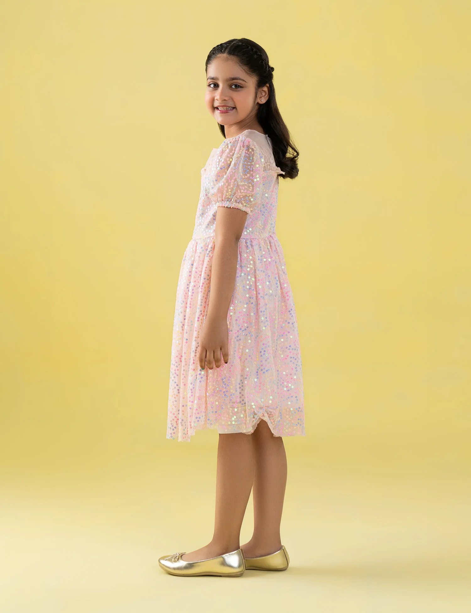 Add a touch of sparkle to her special occasions with this elegant sequin embellished dress. Designed with a soft sheer neckline, delicate puff sleeves, and a beautifully flared skirt, this dress features shimmering sequin details that catch the light with every movement. The lightweight, comfortable fabric allows easy wear all day long, making it perfect for birthdays, weddings, festive celebrations, and parties. A graceful and dazzling choice for little girls who love to shine.