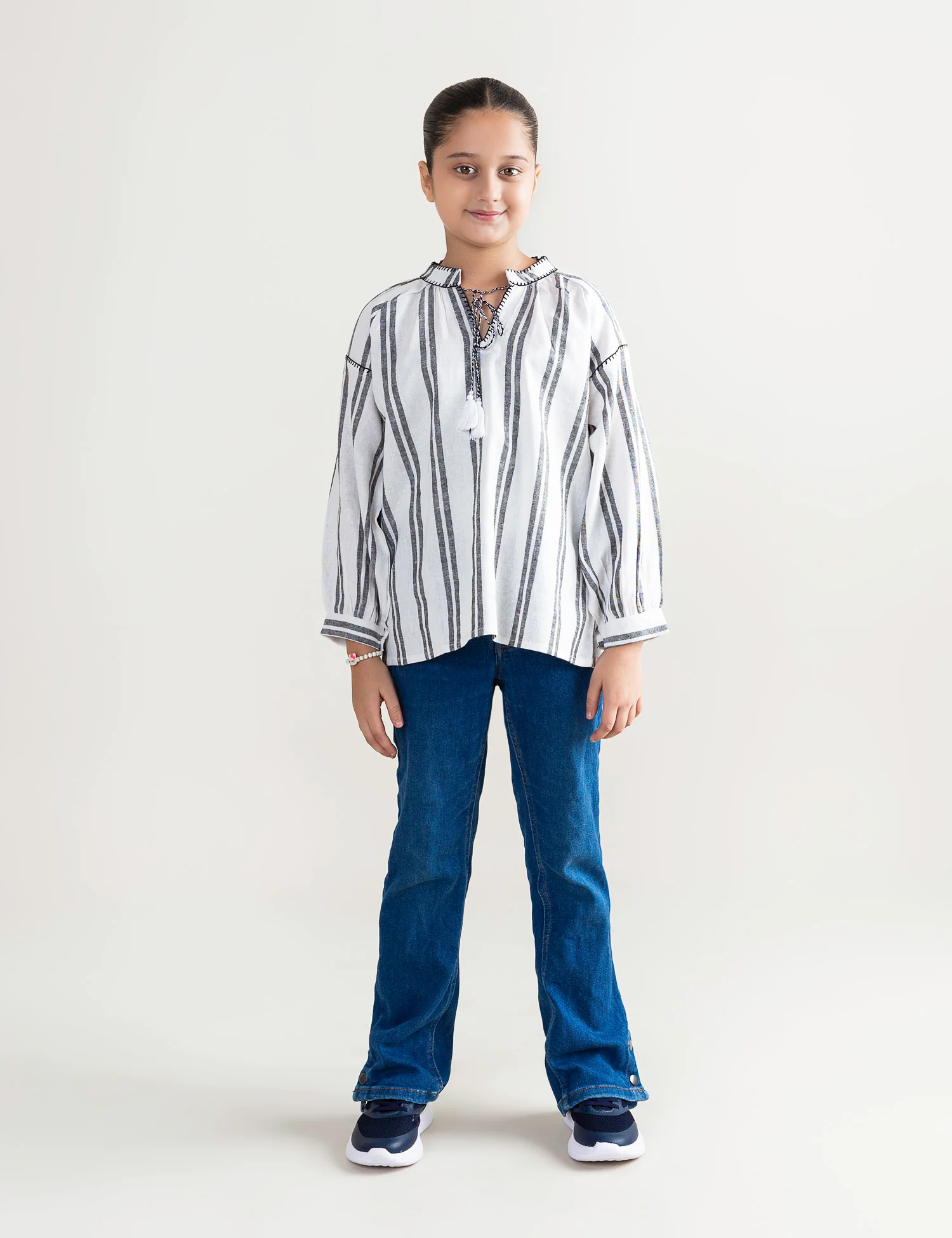 This stylish black and white striped peasant top for girls combines traditional charm with modern comfort. Featuring a round neckline with a tasseled tie detail and three-quarter puff sleeves, it offers a relaxed yet elegant look. The soft, breathable fabric ensures comfort for all-day wear, making it perfect for casual outings, family gatherings, or school events. The contrast stitching along the neckline and sleeves adds a refined finishing touch.