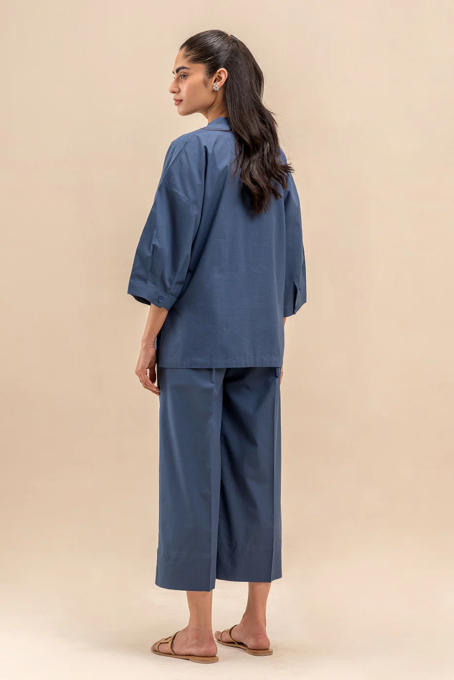- Description: Solid Coord Set Comprising Of Band Collar Top With V Neck, Wider Cuff Openings Along With Side Slits Paired With Elasticated Waist Culottes With Cross Pockets Detail.