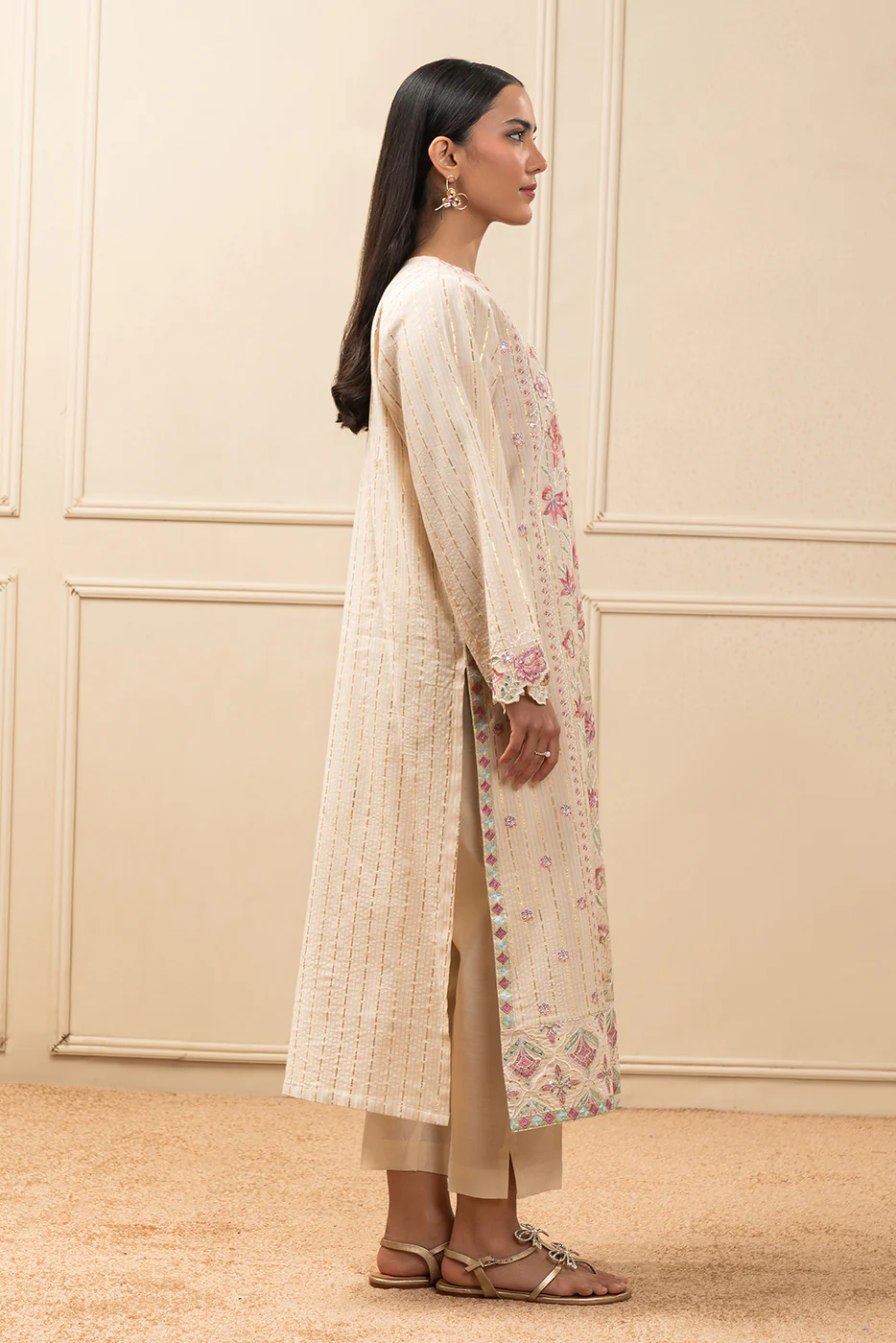 - Description: Embroidered Front &Amp; Sleeves In Pastel Hues Finished With Had Embellished Details On Neckline.. Paired With Straight Pants.