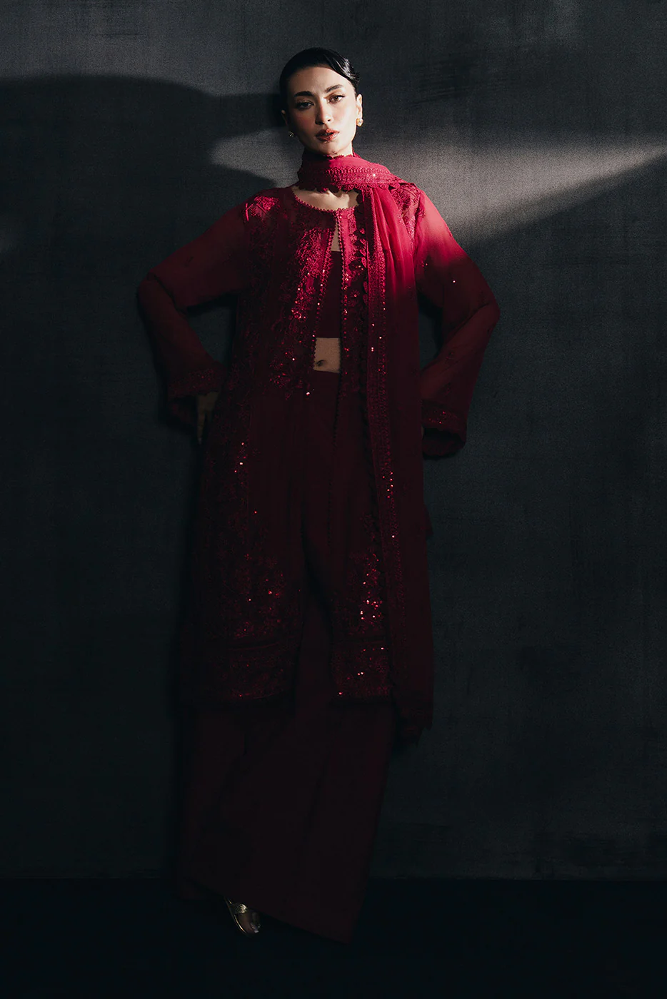 4 PIECE EMBROIDERED CHIFFON SUIT-CARMINE RED (UNSTITCHED)—