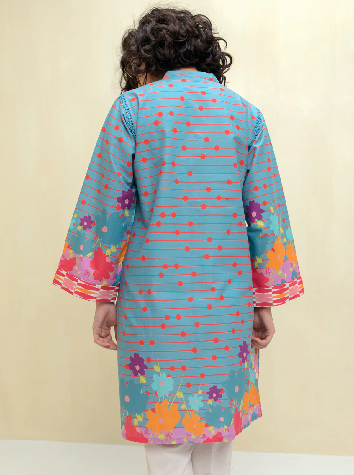 - Description: Floral Colourful Print With Square Armhole Shirt With Lace Detail On Shoulder .V Neckline With Buttons Detail.